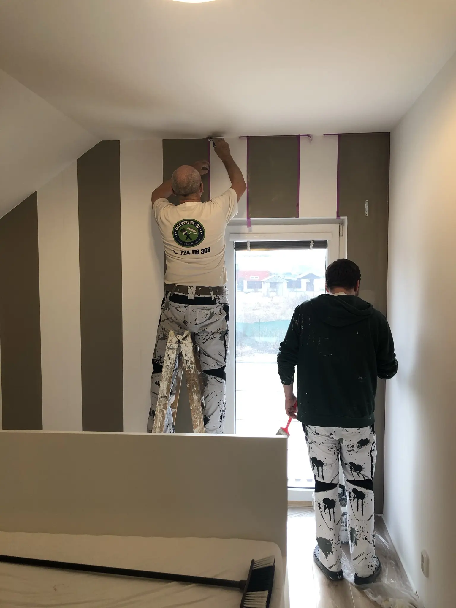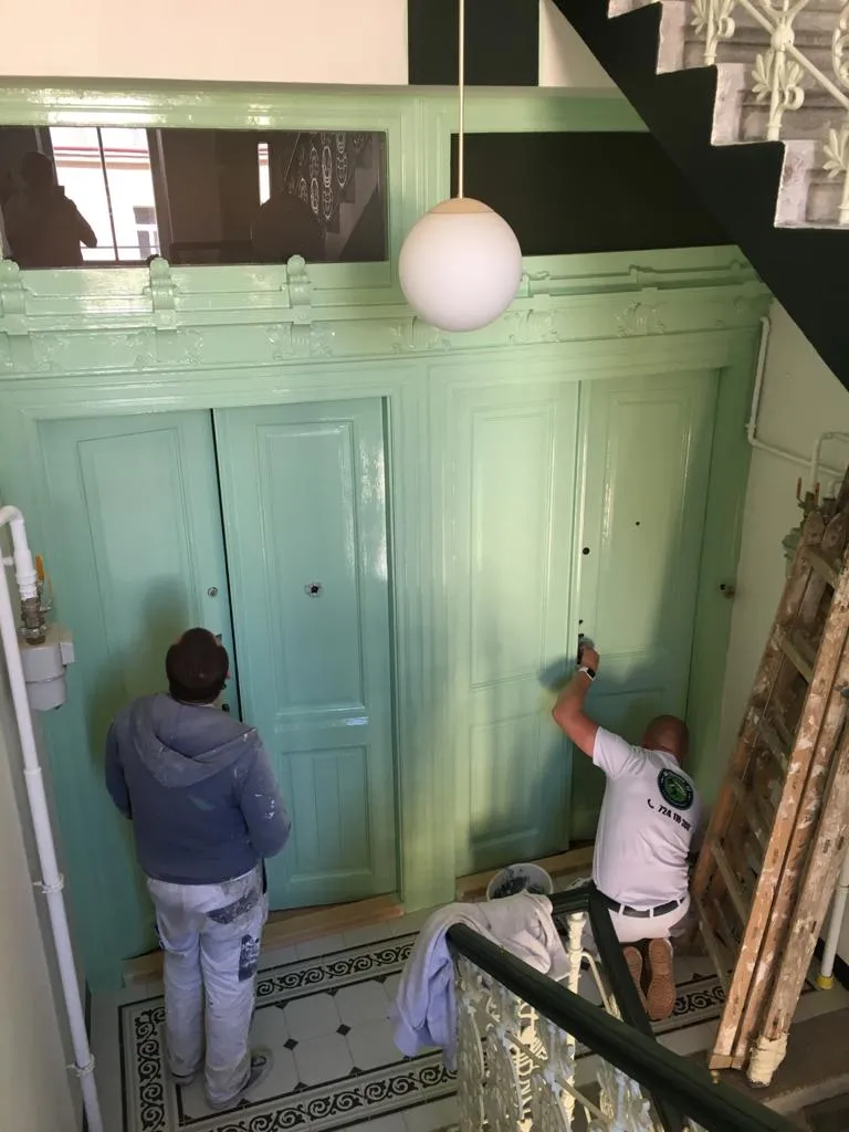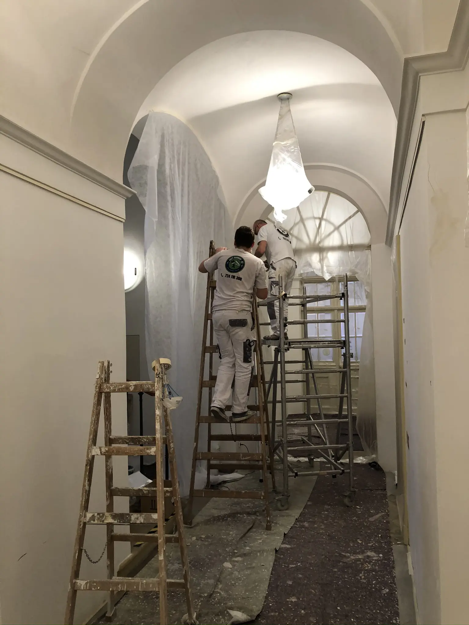 Kompletní výmalba společných prostor, nátěry soklů a kovových prvků, lepení ochranných rohů.