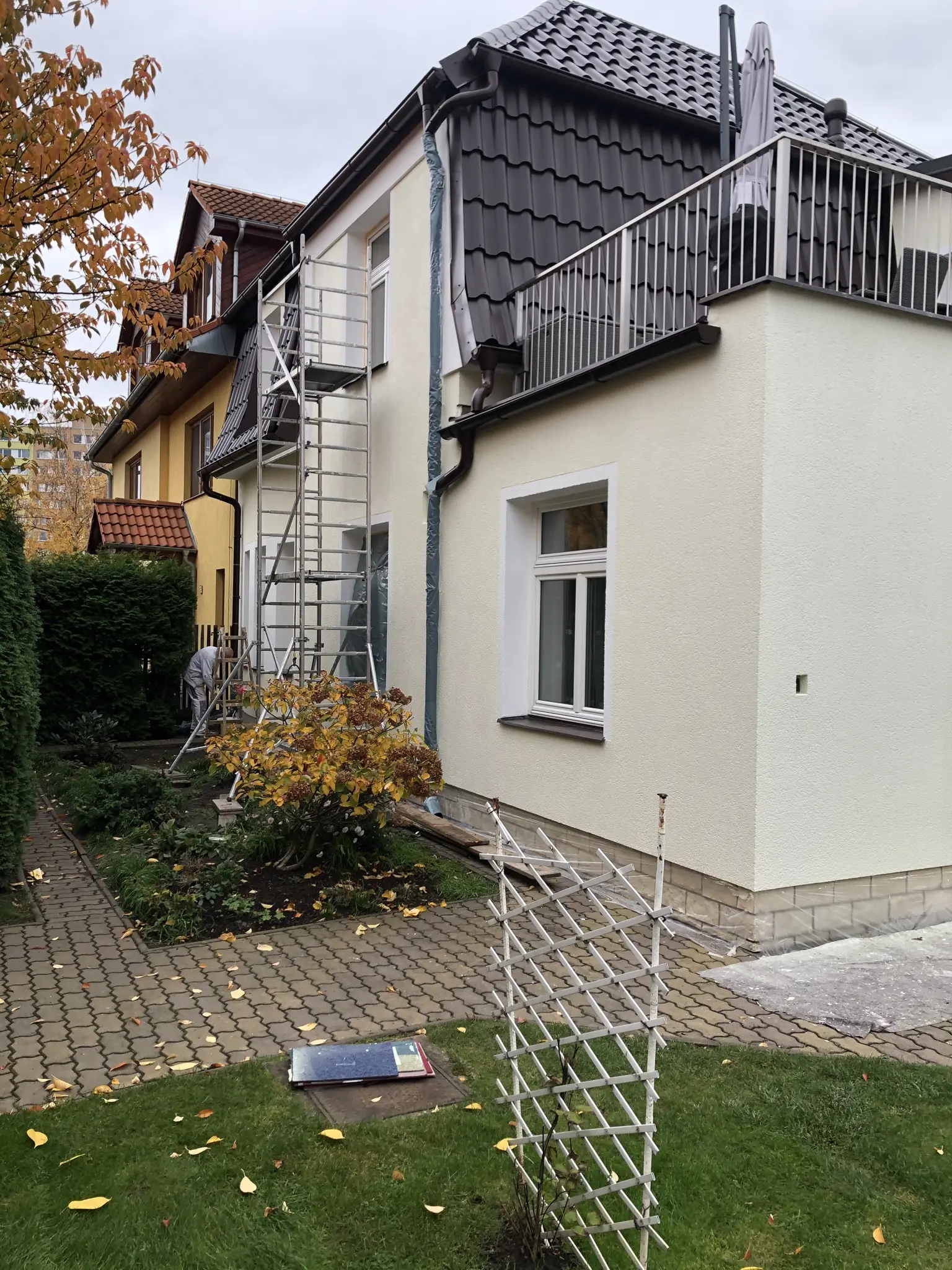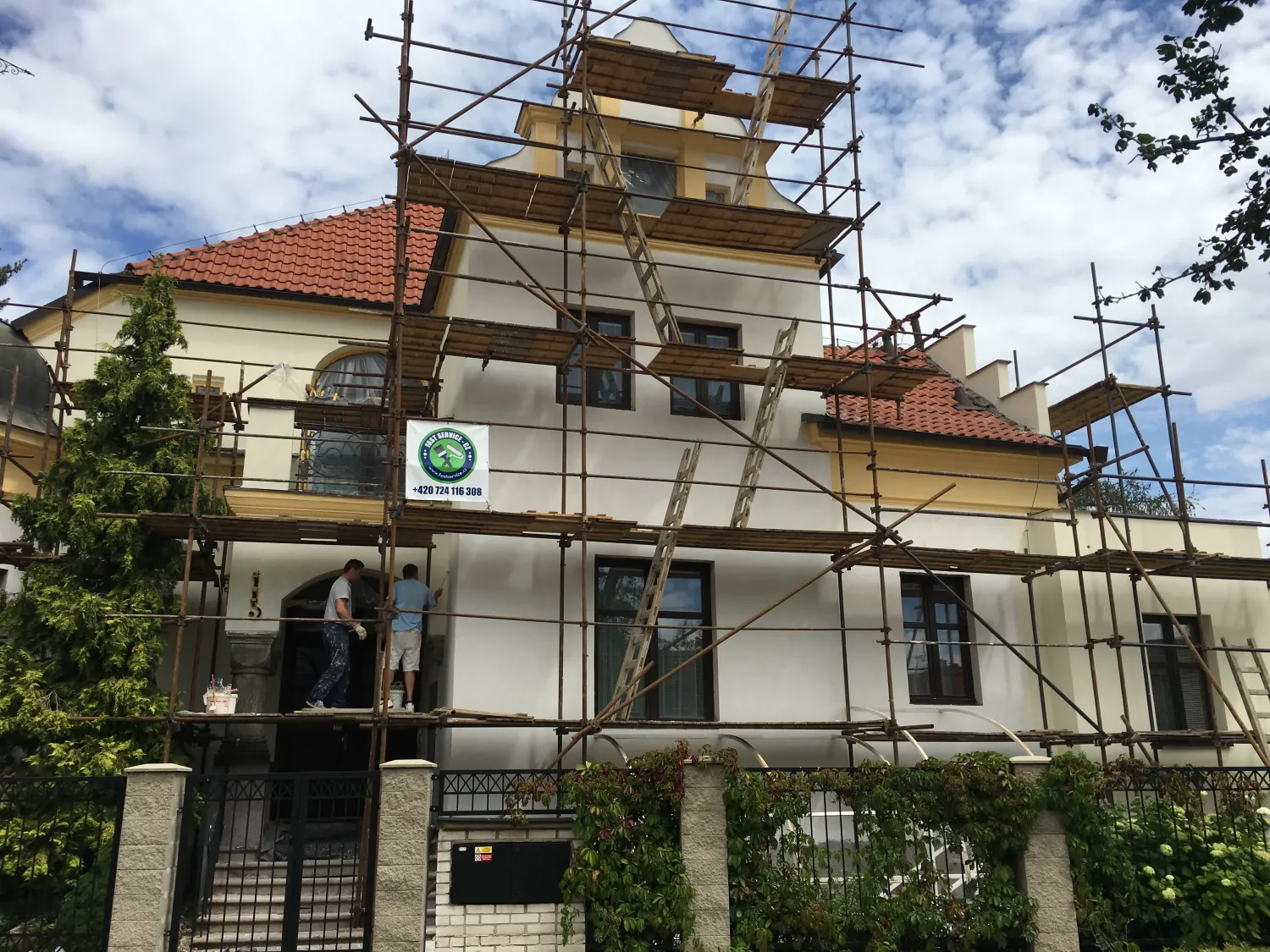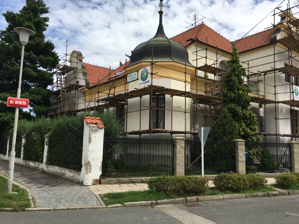 Opravy havarijního stavu omítek, výmalba schodiště vstupu a domků správců.