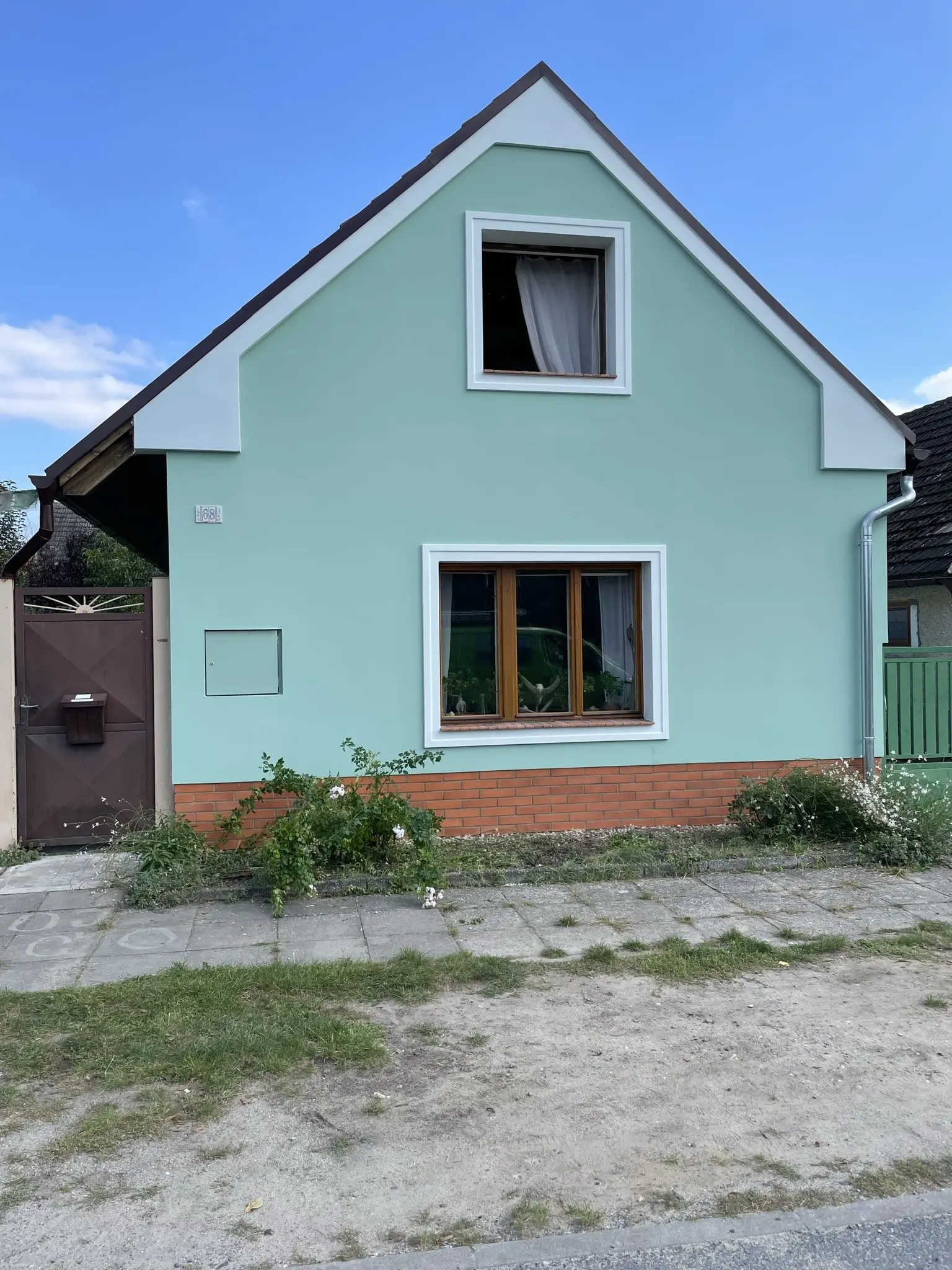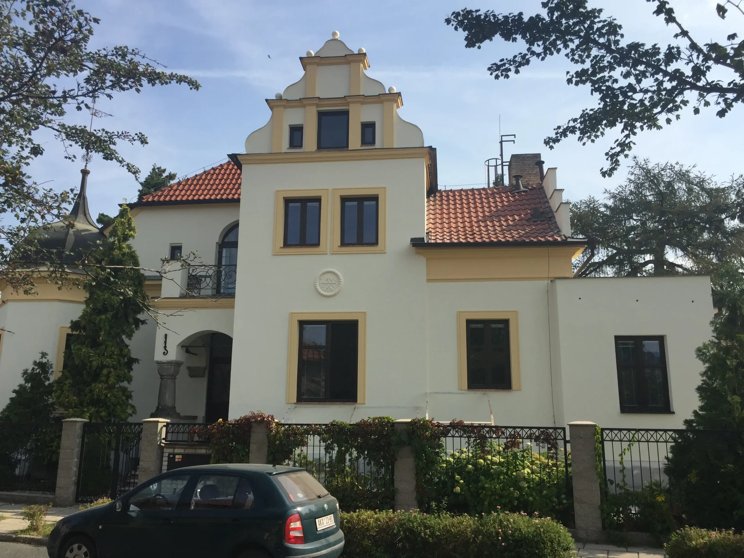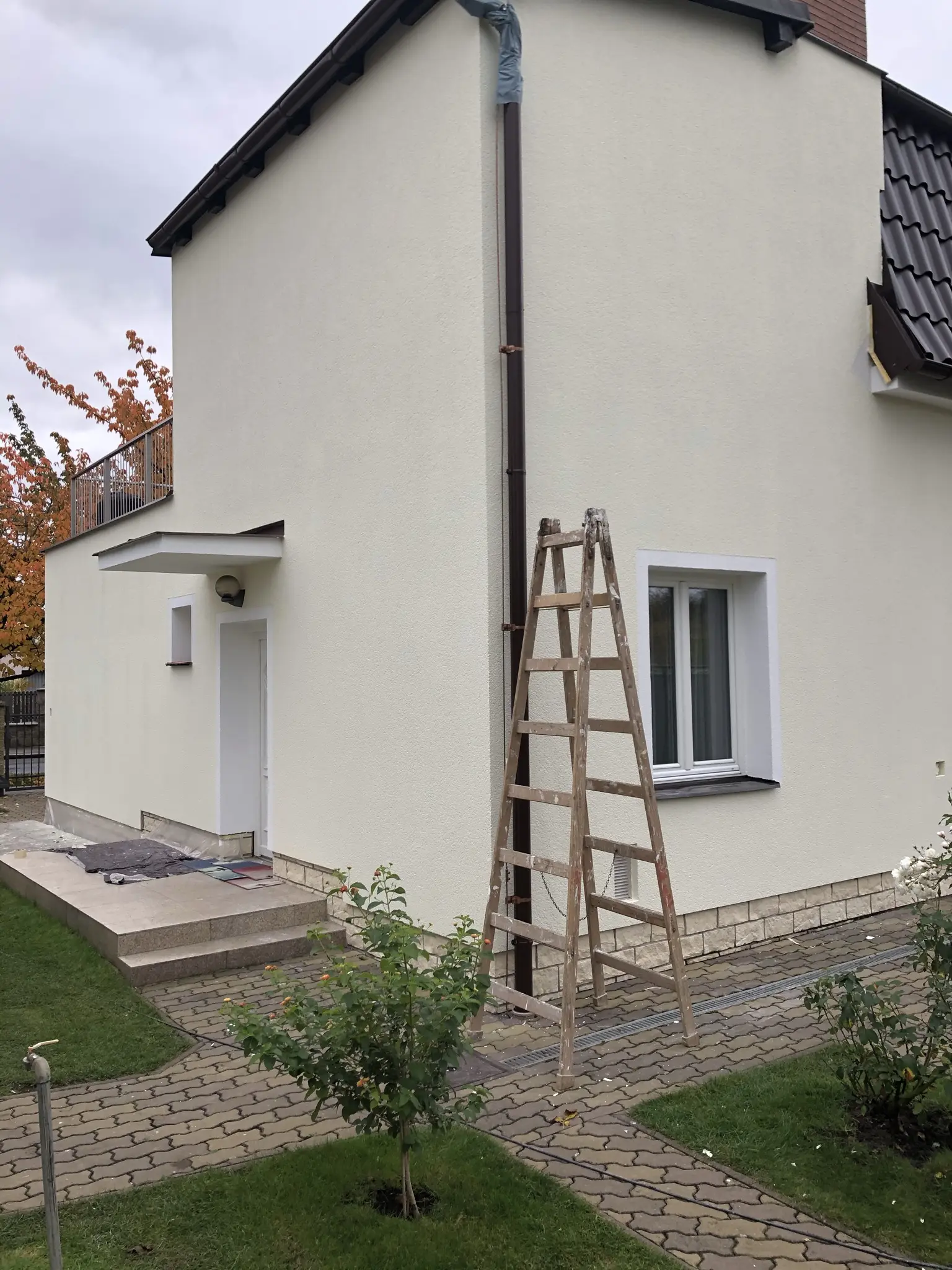 Opravy havarijního stavu omítek, výmalba schodiště vstupu a domků správců.